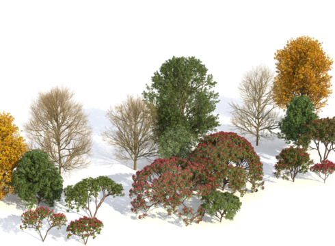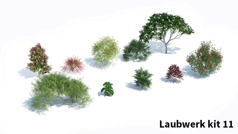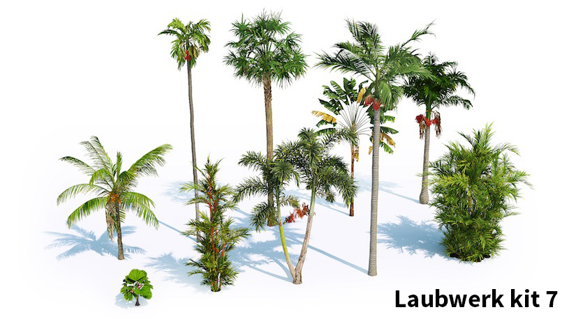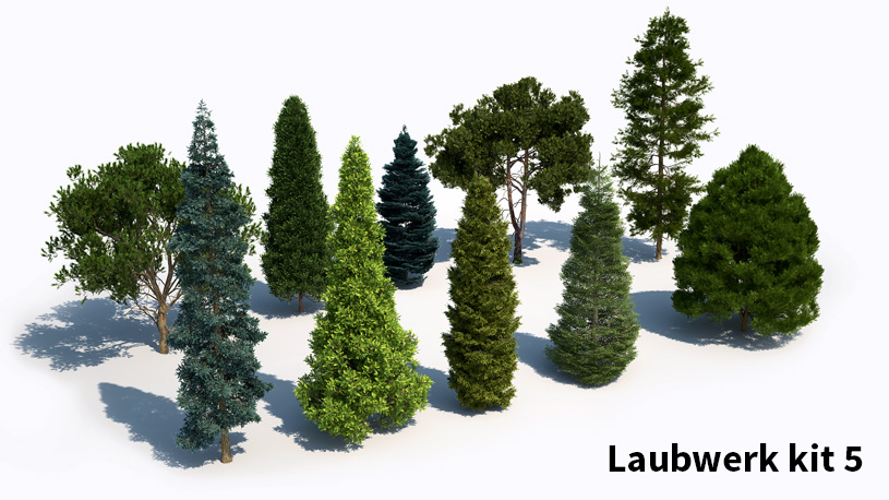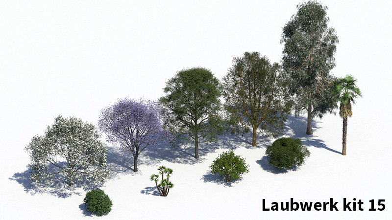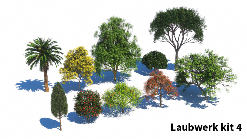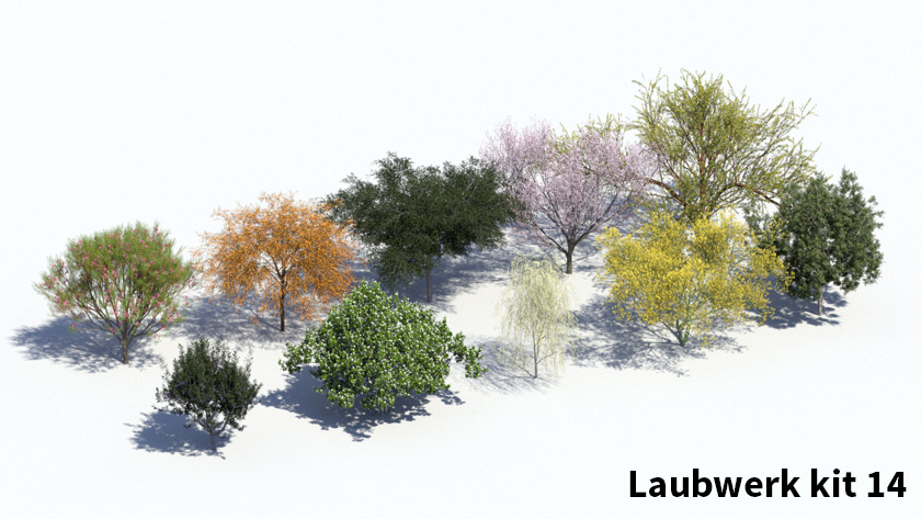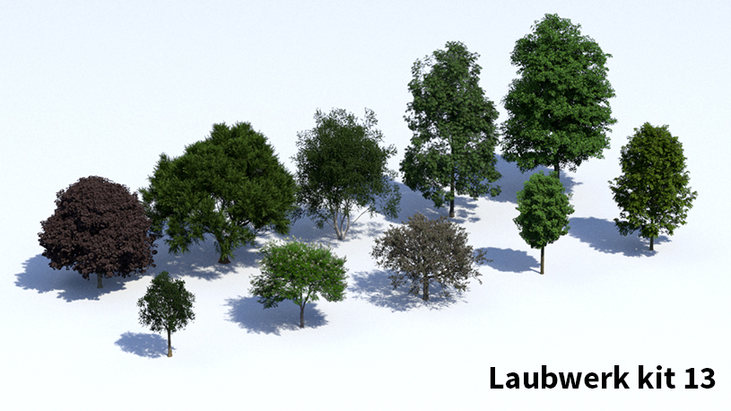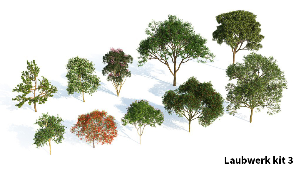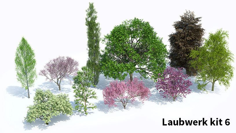 De hoogwaardige 3D-boommodellen in Laubwerk Plants Kits zijn gemaakt met bladfoto’s met meerdere polygonen in verschillende kleuren en doorschijnendheid. Stam en takken zijn te wijzigen, waardoor je de best uitziende 3D-bomen krijgt die beschikbaar zijn.